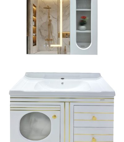 Premium LED Mirror Bathroom Vanity | White–Gold Finish, Ceramic Basin & Multi-Storage Cabinet